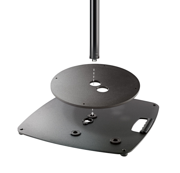 Who does not know the following problem: Indoor gigs in places like pubs, small event spaces and bars, are usually a pretty tight squeeze. Three-legged speaker stands are a tripping hazard and take up too much valuable space. Our new base plate saves space, won’t trip you or your bandmates up, and lets you take optimal advantage of the space you have. The three options for positioning distance rods mean you can tuck a speaker more tightly into a tight corner. The base plate can be used with all distance rods with a M20 thread.