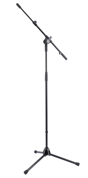 High-quality microphone stand with telescopic boom arm. Die-cast base with folding legs. Unique design retains all screws and levers without tension. Patented clamping lever can be fixed in any position, for holding mic cable, etc.