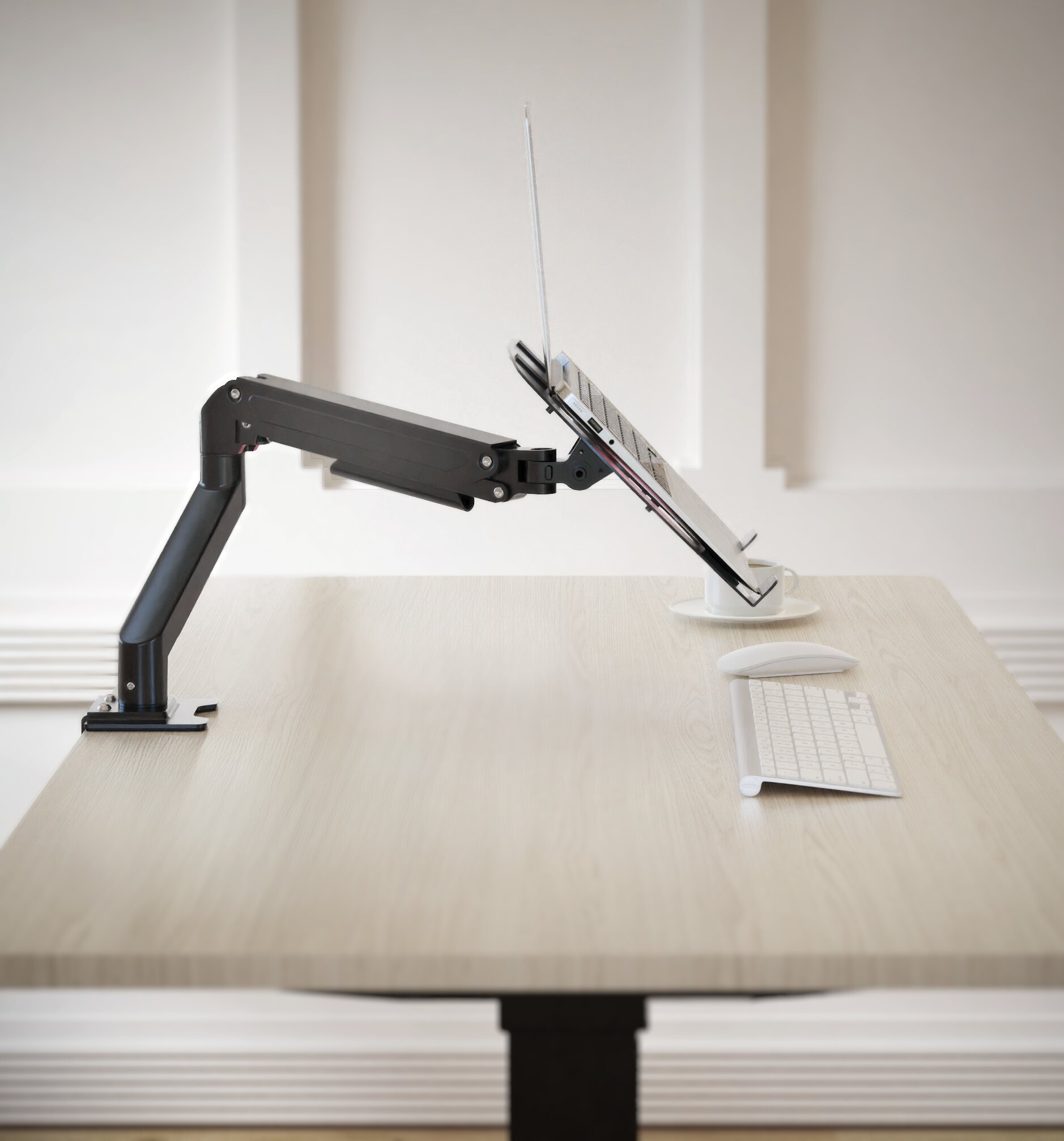 Die individuelle Lösung für Ihren Arbeitsplatz: mit dieser Tischhalterung können Sie Ihren Laptop platzsparend und ergonomisch positionieren. Die robuste Konstruktion mit der integrierten Gasdruckfeder hält einer Belastung bis zu 9 kg stand. Dank der großen stabilen Tischklemme (bis 60 mm Dicke) ist die komplette Halterung schnell montiert und flexibel einsetzbar. Selbstverständlich kann die Ablageplatte für einen perfekten Blickwinkel und eine nackenschonende Haltung noch stufenlos geneigt, gedreht und geschwenkt werden. Darüber hinaus ist der komplette Arm um 360° schwenkbar. Die integrierte Kabelführung sorgt außerdem für einen stets aufgeräumten und professionellen Arbeitsplatz.
