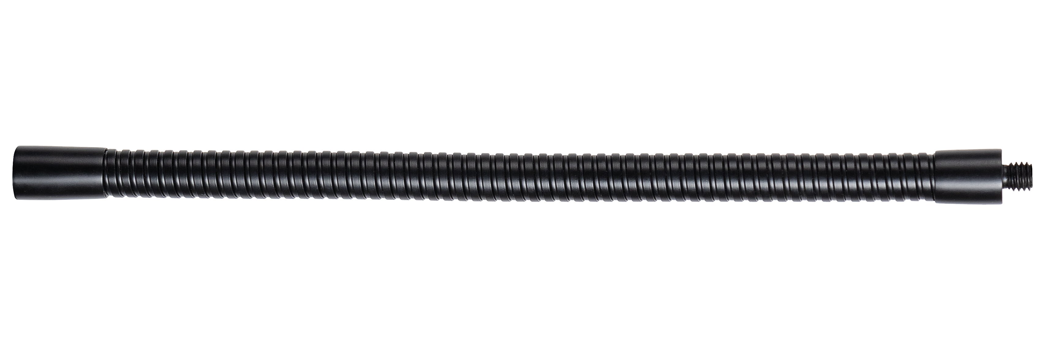 Robust and flexible gooseneck. Durable steel material with black powder coating. The connection threads are 3/8” on both sides, one inside/one outside. The length is 11.811" with a diameter of 0.59". Weight: 0.485 lbs.